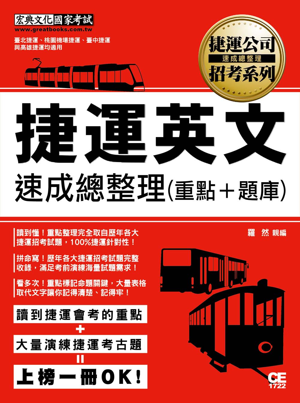 英文作為共同科目一般來說經常給人抓不到範圍、不知從何準備起的感受,因此英文科的備考對考生來說似乎是相對比較不容易的。本書特別針對歷屆捷運招考英文考試的命題趨向來彙整速成重點,幫助考生聚焦頻出考點以求在短時間做最有效率的準備。本書分成兩大部分:「速成重點整理」與「近年試題詳解」: