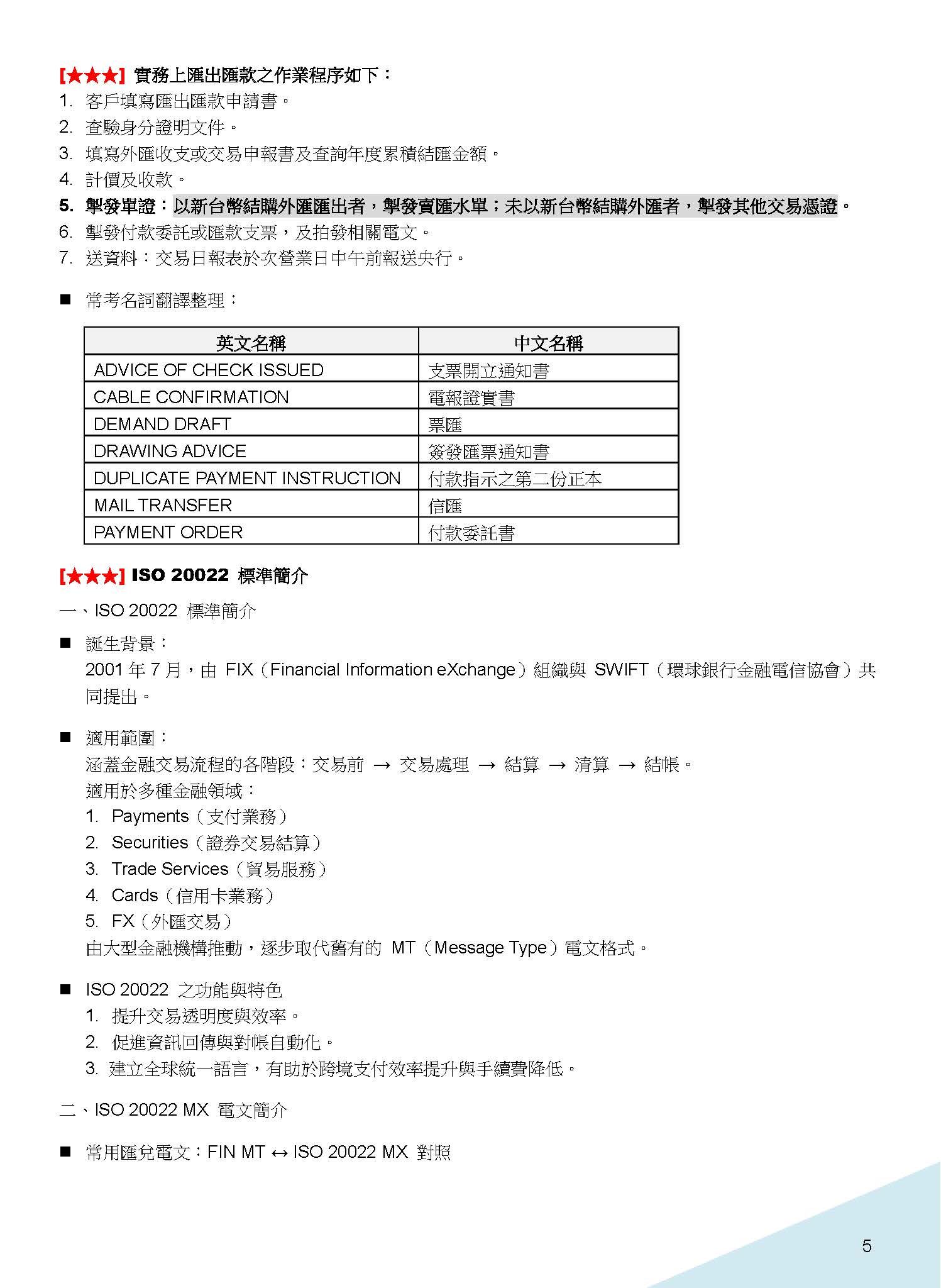 因應114年11月起停用原匯兌使用之SWIFT電文,改採ISO 20022 MX格式,本考試亦自114年11月起適用新規。本版除同步彙整ISO 20022 MX格式命題重點外,更獨家提供「模擬試題:ISO 20022 MX電文之使用(2025年11月起適用)」線上題庫,幫助本書讀者熟悉新制下之考題型態,充實應考實力縮短考取證照時間。
