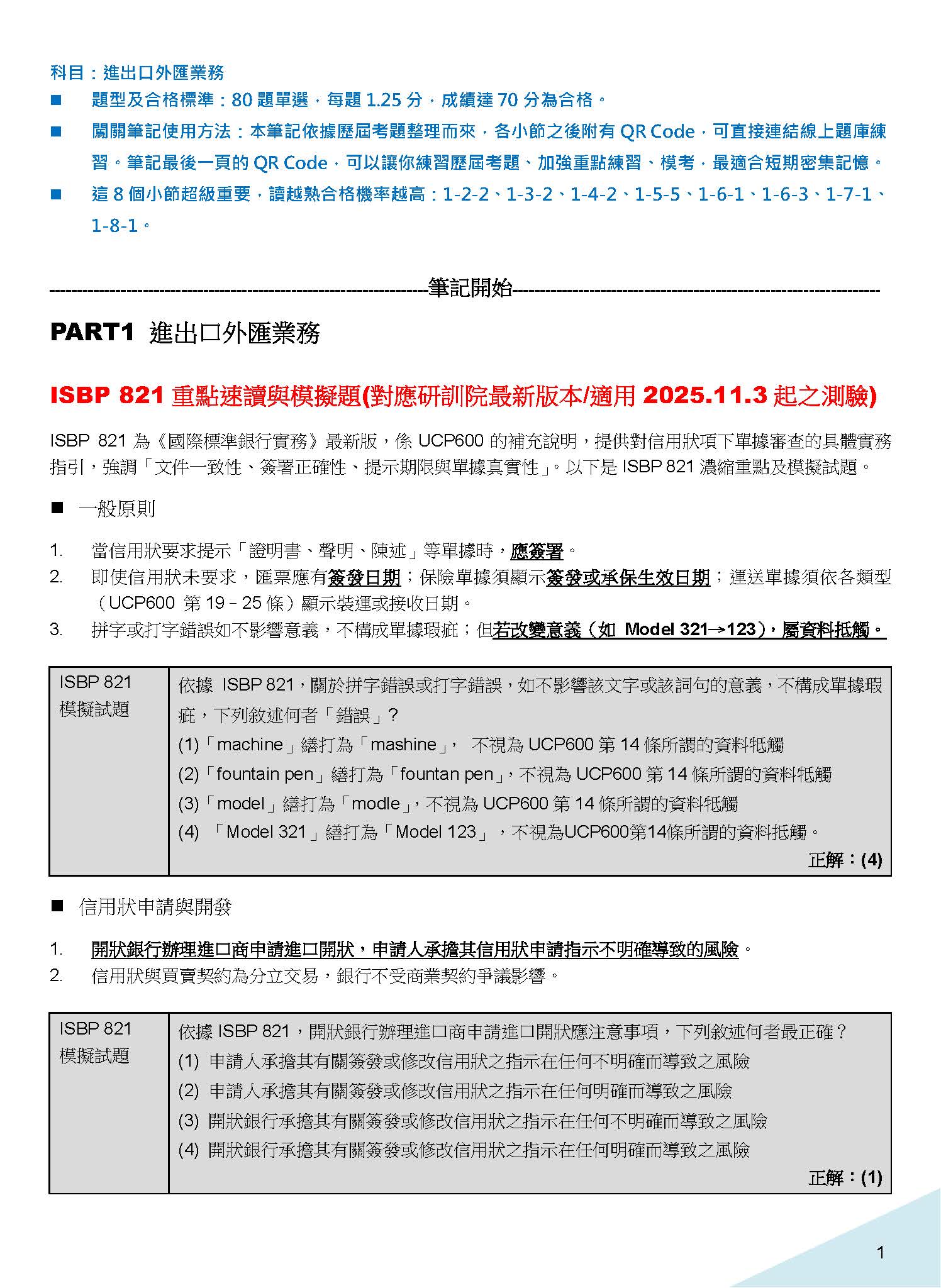 «進出口外匯業務:ISBP 821模擬題/對應研訓院最新版本/適用2025.11.3起之測驗