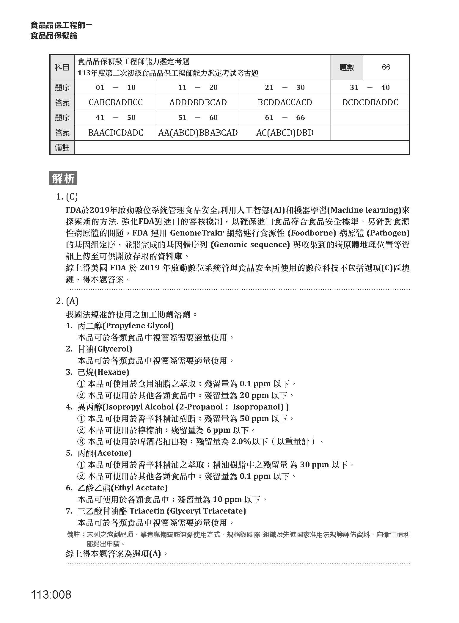 113年第2次、114年第1次食品品保初級工程師能力鑑定試題暨解析