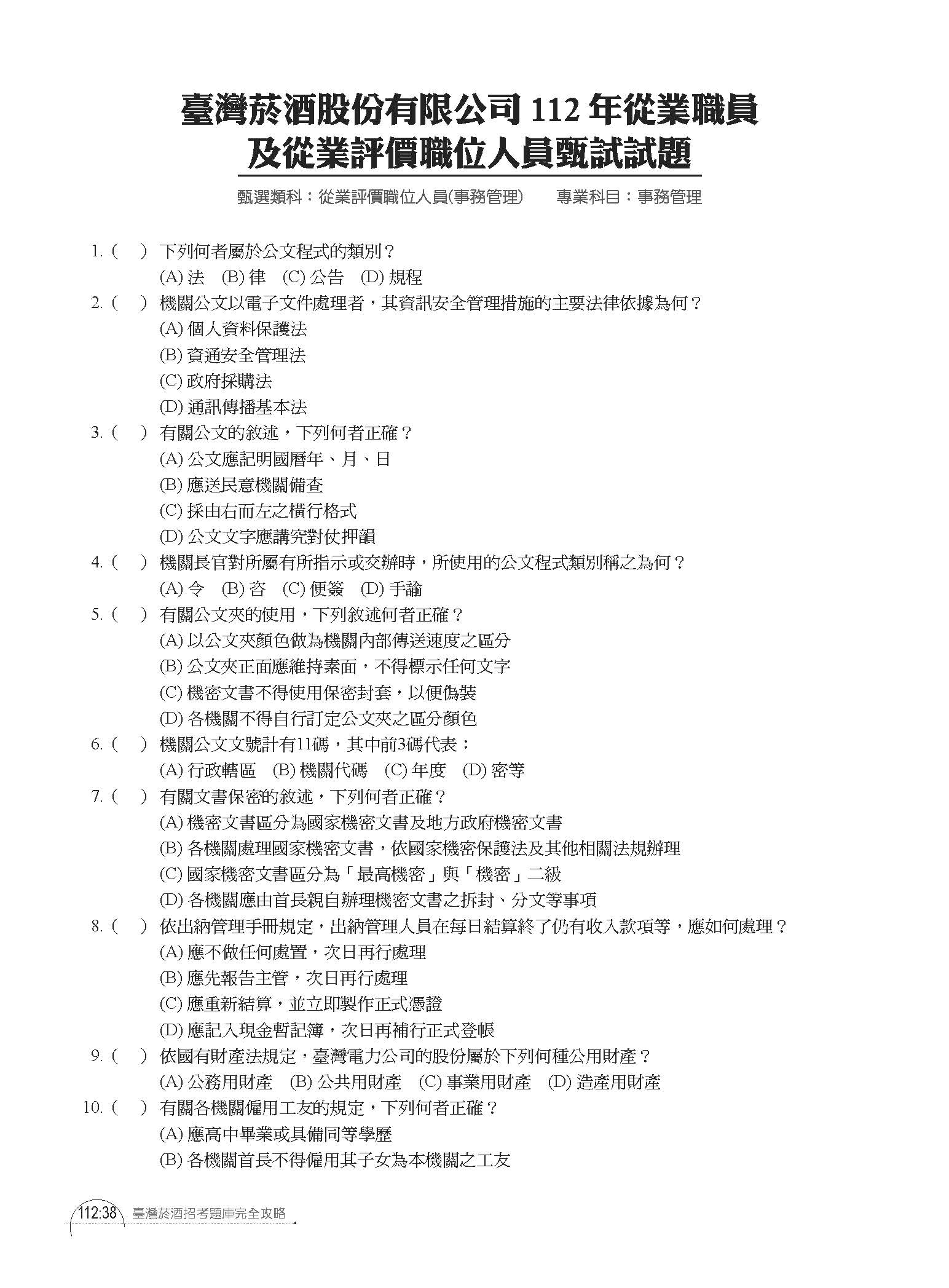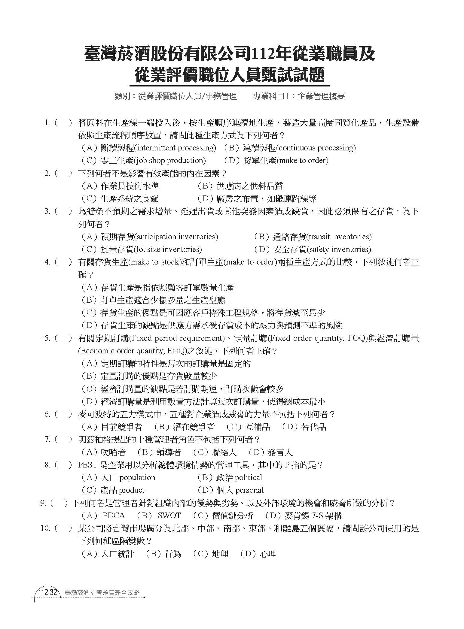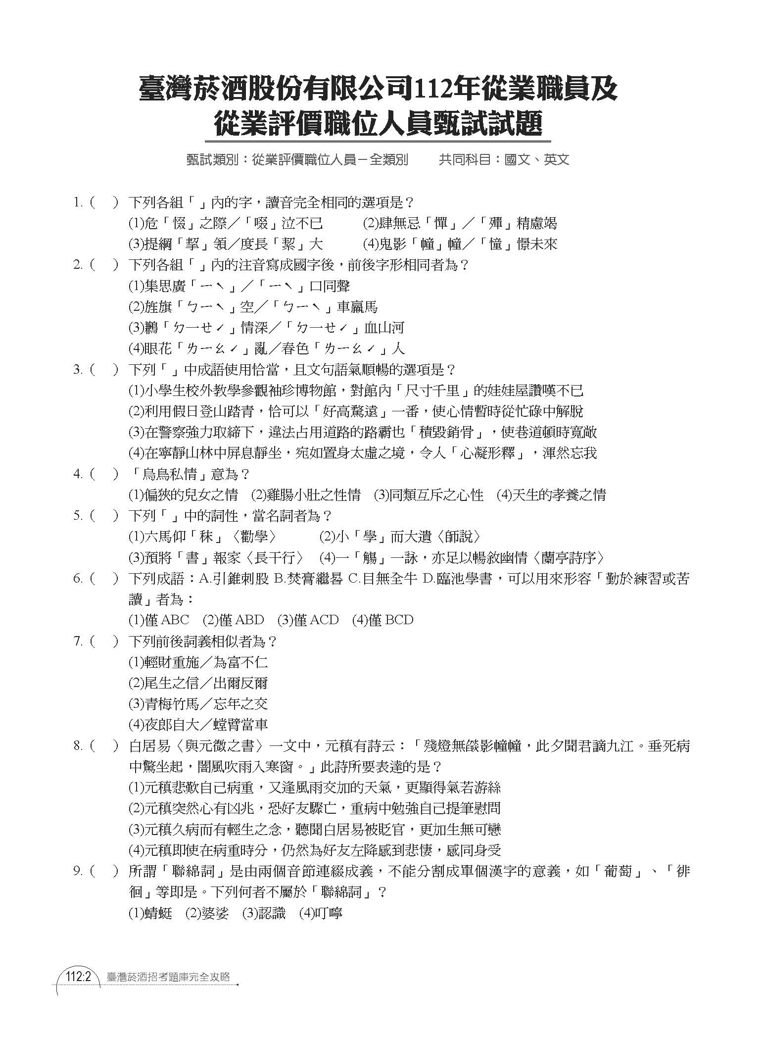 臺灣菸酒股份有限公司112年從業職員及從業評價職位人員甄試試題與詳解