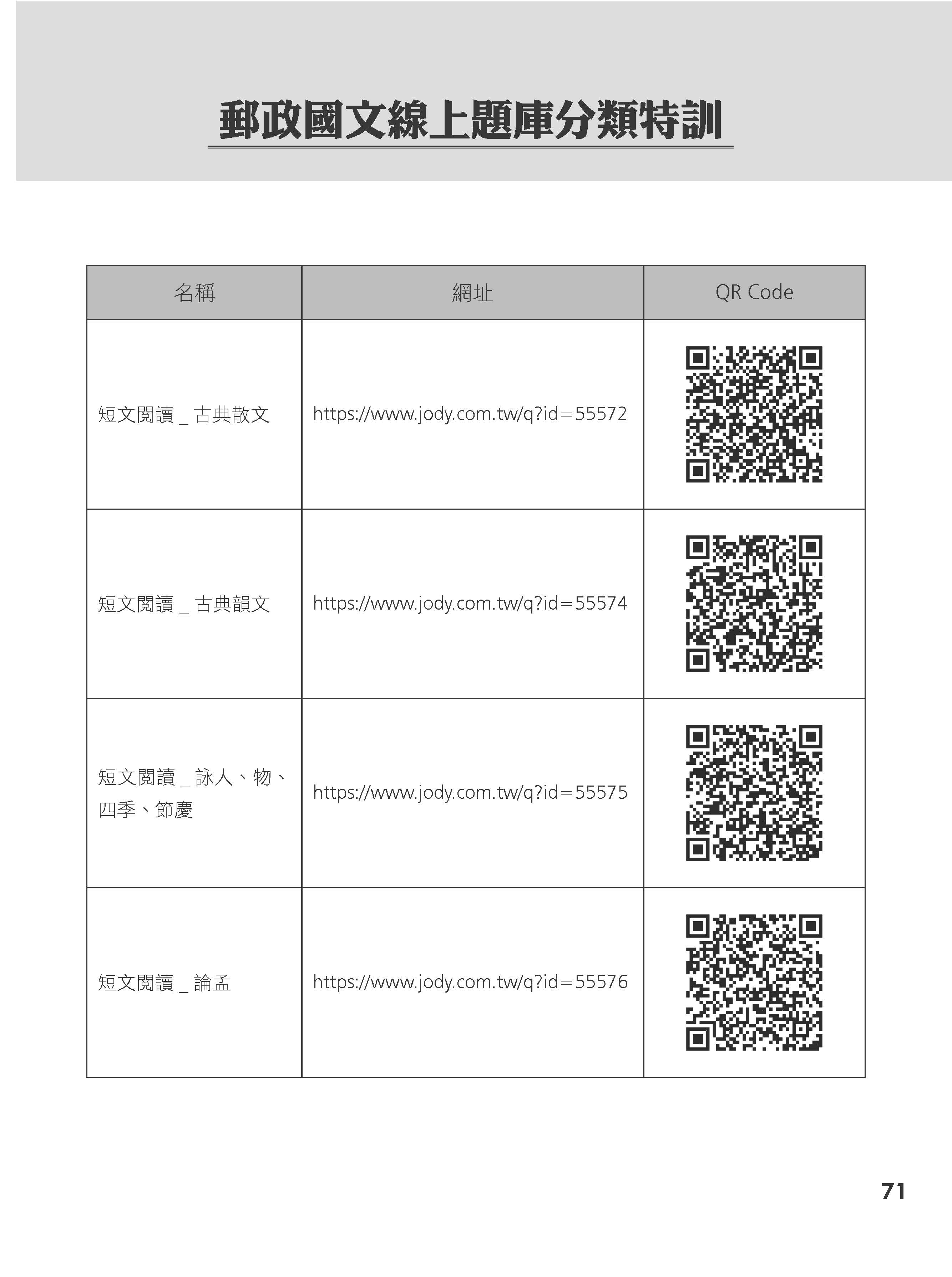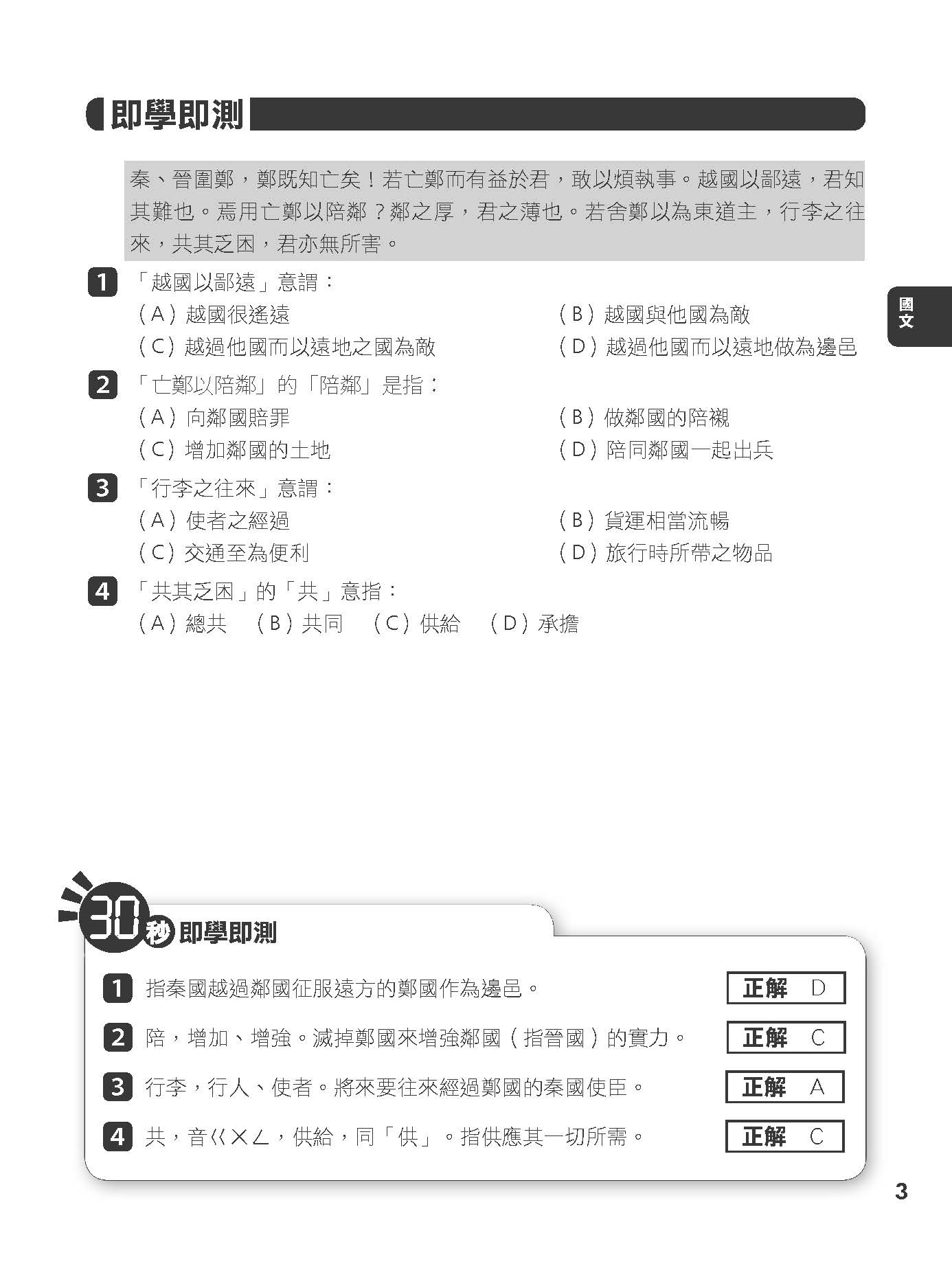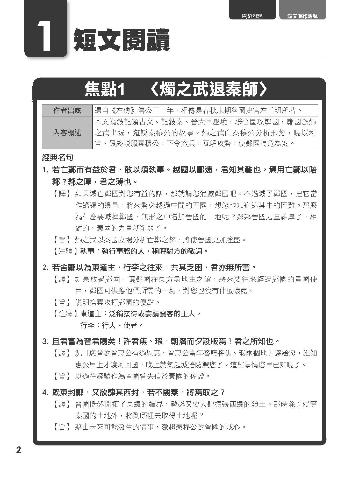 「共同科目」部分,內勤人員的國文考科於今年有重大變革,由傳統的選擇題改為「短文寫作」與「閱讀測驗」。許多考生在準備新的考科內容,往往不知從何著手。「得勝」老師以教育部所公布的「文言文核心選文40篇」為本,收錄在國考、就業考試中時常出現的文章作重點歸納,務求讓考生在有限的時間中,快速提升自己的古文閱讀能力。並且親自動筆撰寫「範文」供考生觀摩學習。