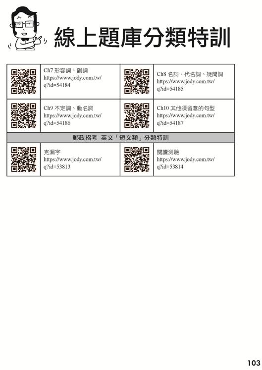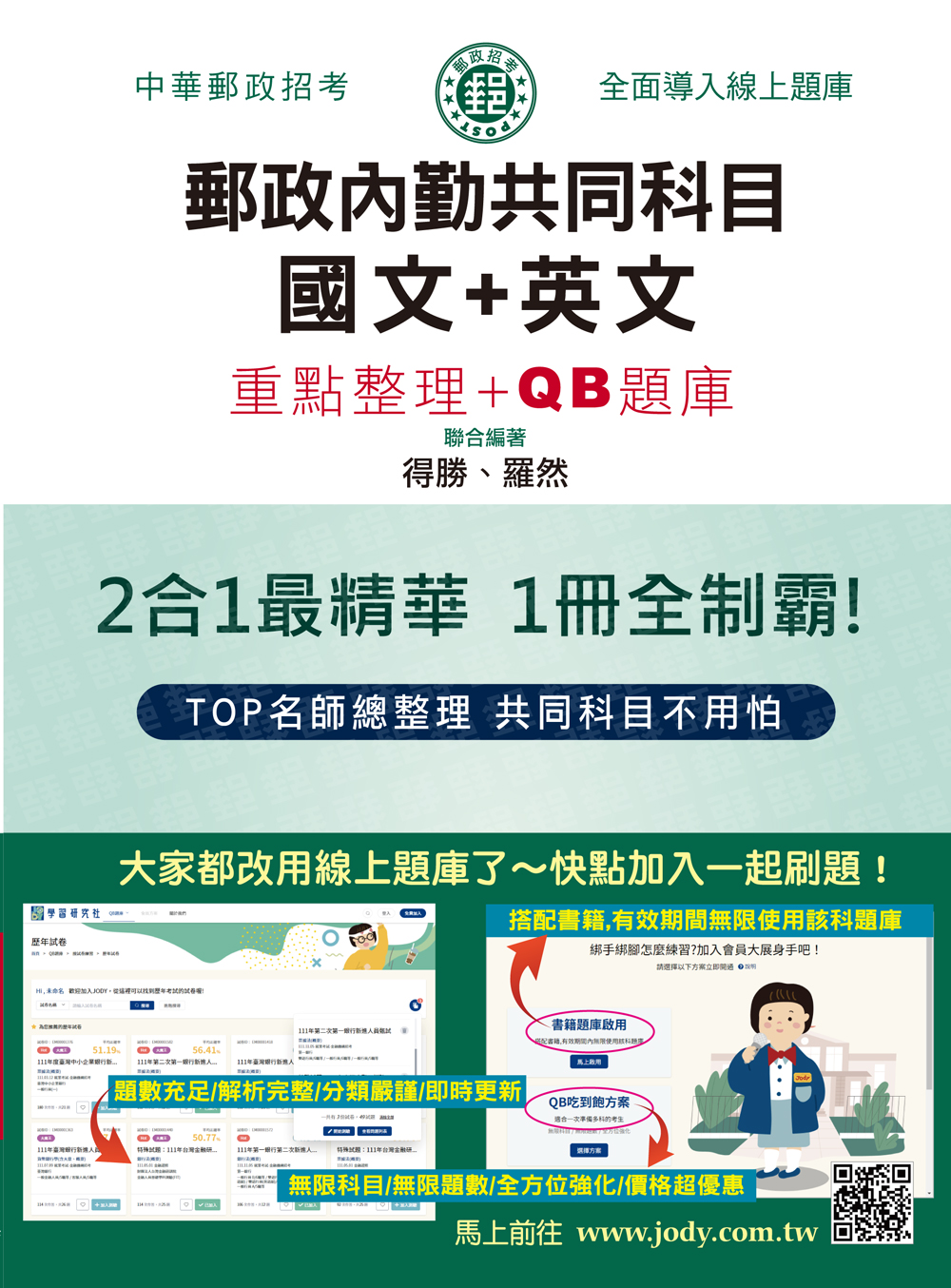 最後,「機會是留給準備好的人」,一本好的速成書,考生只須花一個月時間準備,就掌握到考試的命題方式與考試重點。希望宏典文化「郵政招考內勤速成」能夠幫助考生在中華郵政招考的戰場中搶得先機。