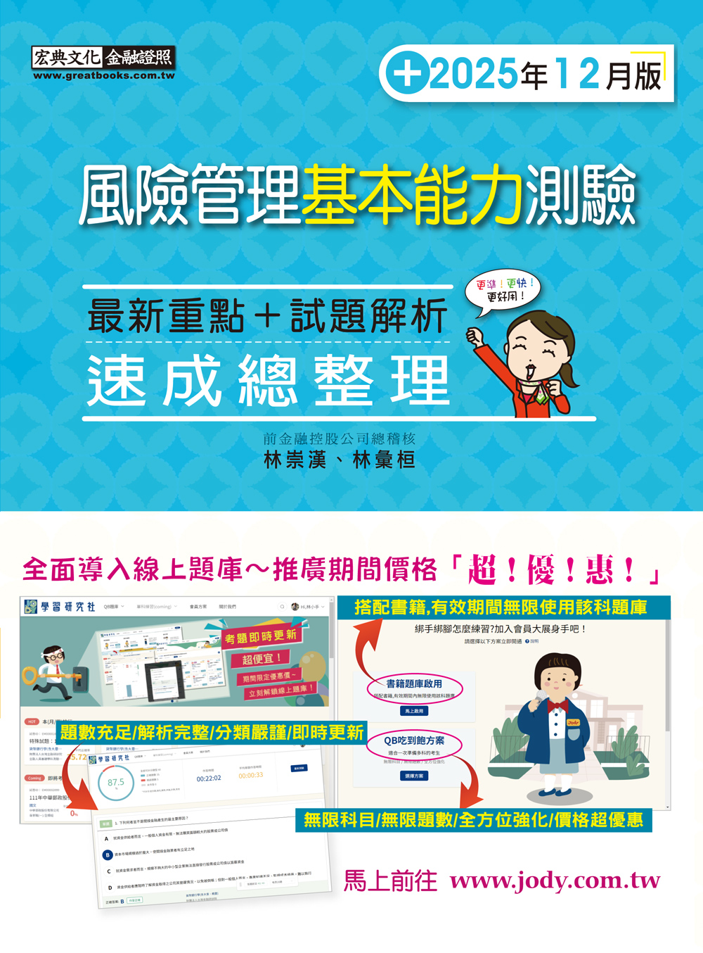 本書即為參加風險管理基本能力測驗所做的應試重點整理,全書分為三大篇: