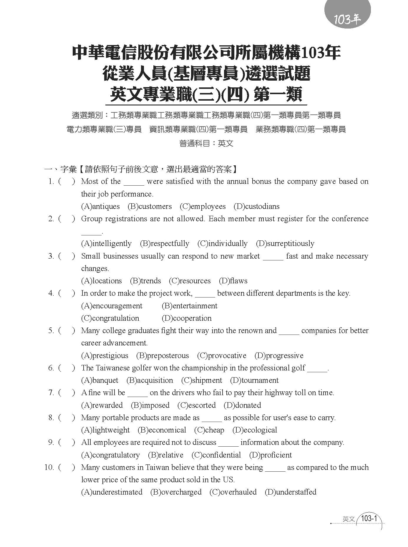 1.中華電信英文 歷屆試題