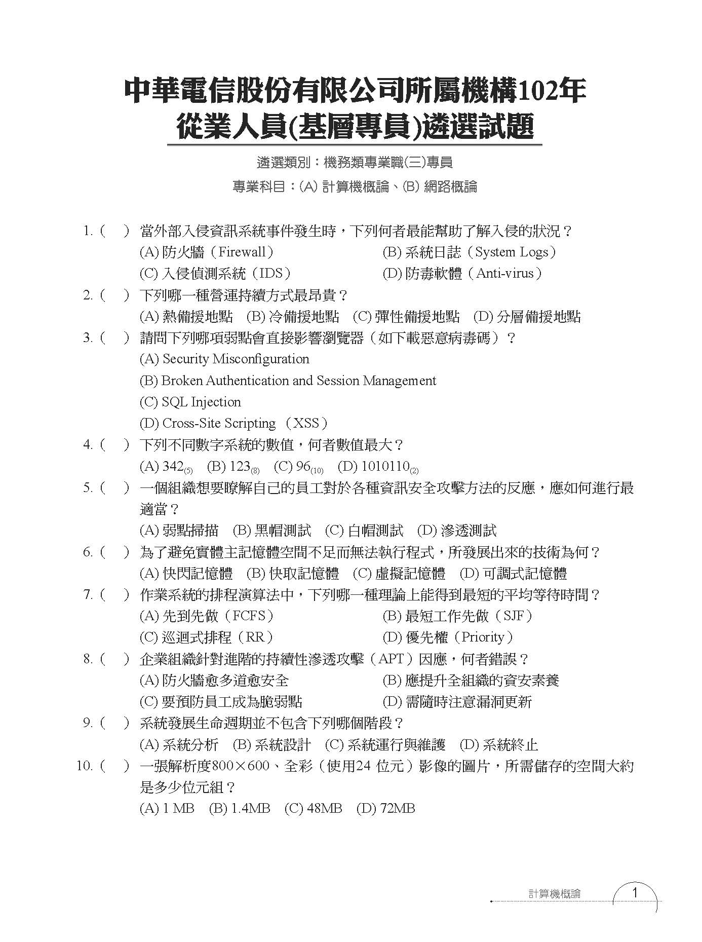 1.中華電信 計算機概論歷屆試題