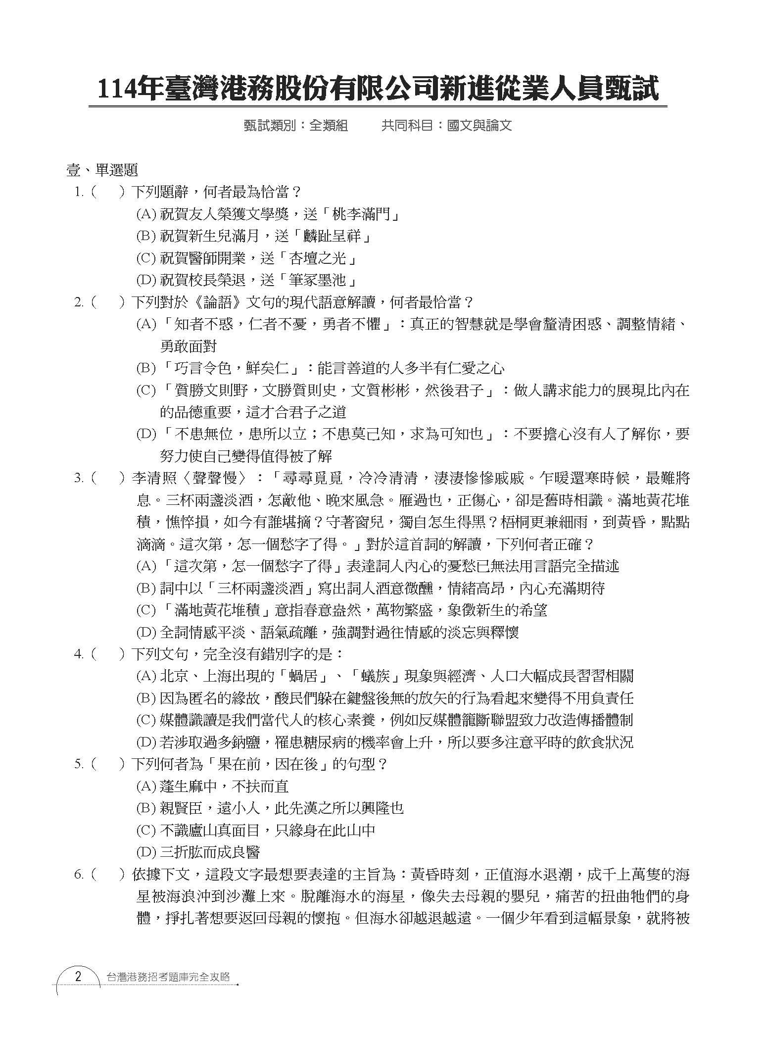 114年臺灣港務股份有限公司新近從業人員甄試 國文與論文
