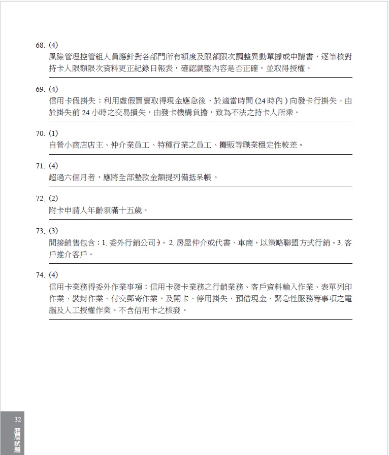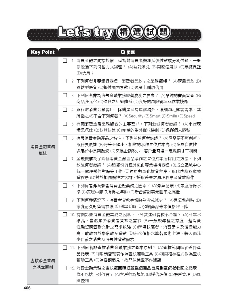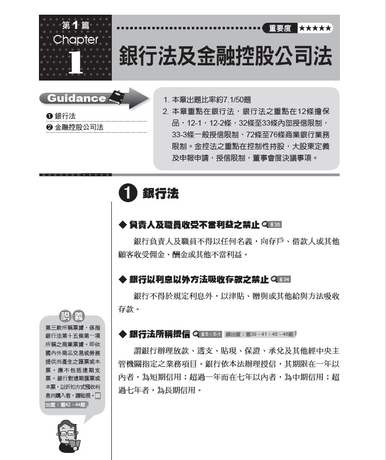 近期重要修法諸如:銀行資本適足性及資本等級管理辦法、金融控股公司及銀行業內部控制及稽核制度實施辦法、金融機構通報重大偶發事件之範圍申報程序及其他應遵循事項、國際合作商品新臺幣相關款項收付之核准、金融消費者保護法......等。本書特進行全文修訂使之「對應最新法令規定」,確保考生不至於因讀到舊法而答錯題目。