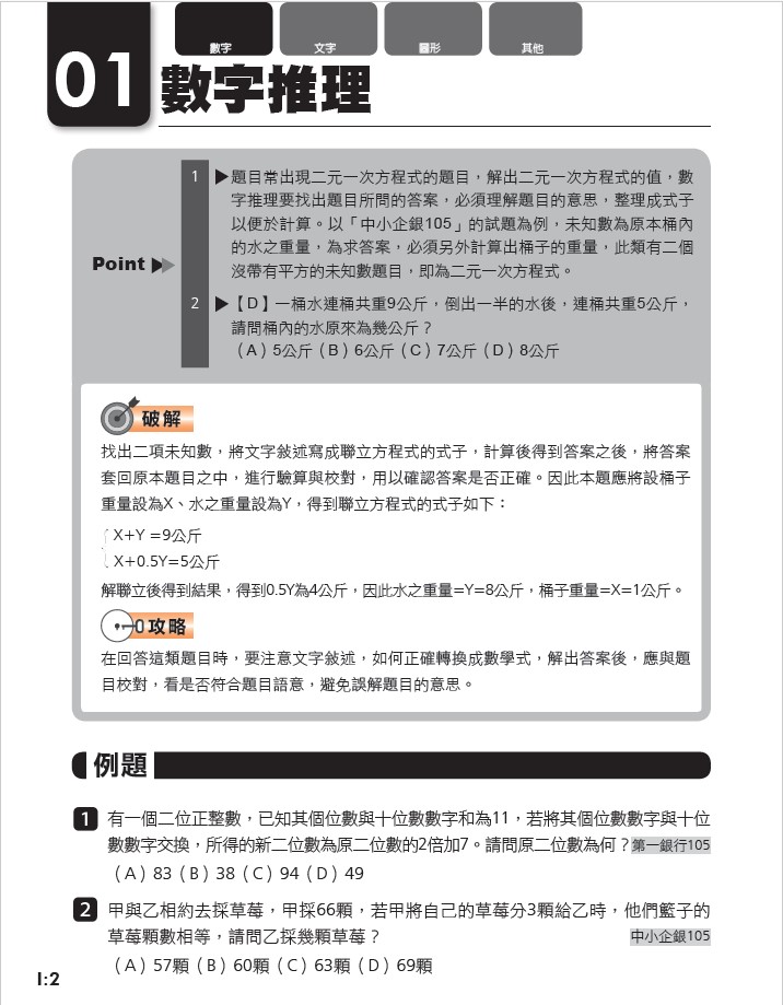 數字類:偏重於數字推理與計算,設定未知數並列出方程式,再行計算。