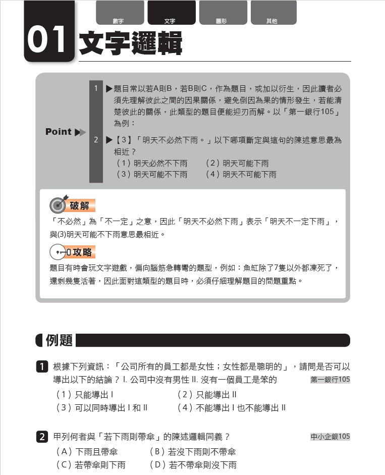 本章節將邏輯推理試題的解題技巧,並依照題目類型的不同加以分類,共分成四大類、三十種題型,每種題型皆以Point要點來解釋,並以「破解」與「攻略」來加以說明,並提供相關試題供讀者練習,當然每一題皆附上完整解題說明。