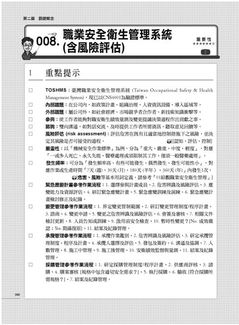 全書有效控制篇幅,為考生整理出「真正會考的重點」,拒絕沒重點的長篇大論。讓您輕鬆準備,高分過關,是您準備職業安全衛生技術士的最佳良伴!