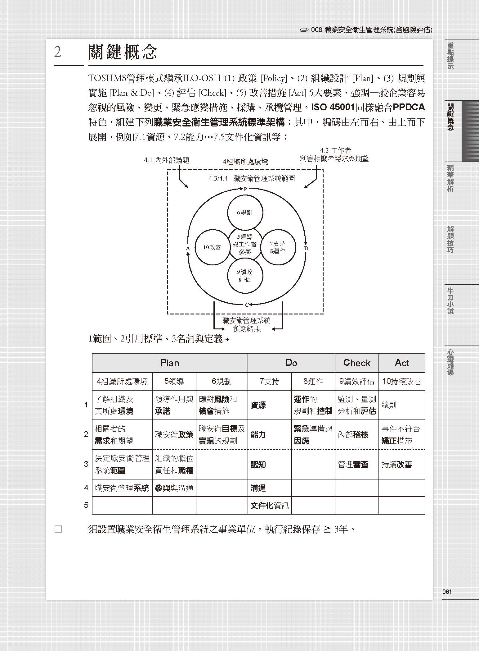 全書目錄章節參考「綜觀職業安全衛生管理」章節內涵概念予以規劃,以營造作業為例,因好發「墜落、物體落下、物體倒塌崩塌」3種重力災害,並反應在營造安全衛生設施標準相關規範,因此根據此一想法將其相關連之法規實務與專業知識為同一章節整合為「墜落災害防止、物料處置與營造作業安全衛生設施標準」,力求減少各章節重複之處,達到「事半功倍」之效。