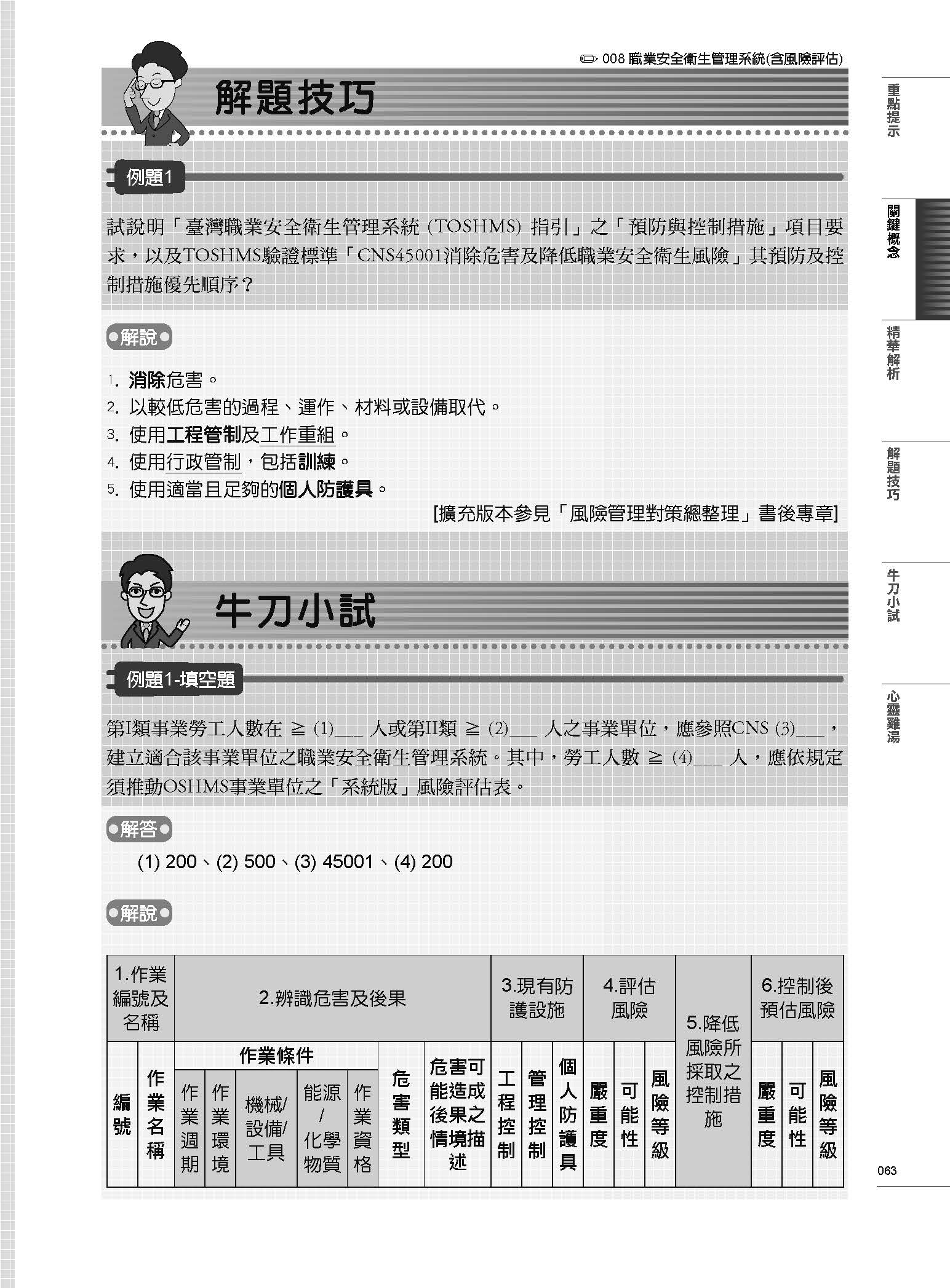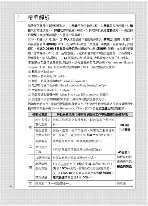 「綜觀職業安全衛生管理」屬本書導讀章節,將職業安全衛生管理員訓練課程重要觀念融入圖表整理,說明不同主題之相關性與異同,提供理解相關議題所需背景知識;搭配整理「各章對應技能標準」說明所對應技能標準與所需指標能力,協助讀者「見樹又見林」在準備證照考試之際,亦能同時了解與實務應用職業安全衛生管理精要,成為事業單位即戰力。