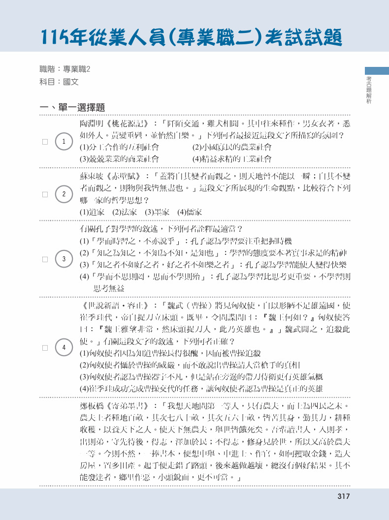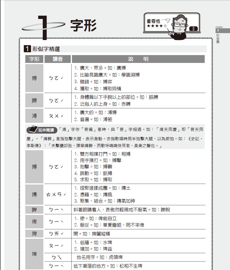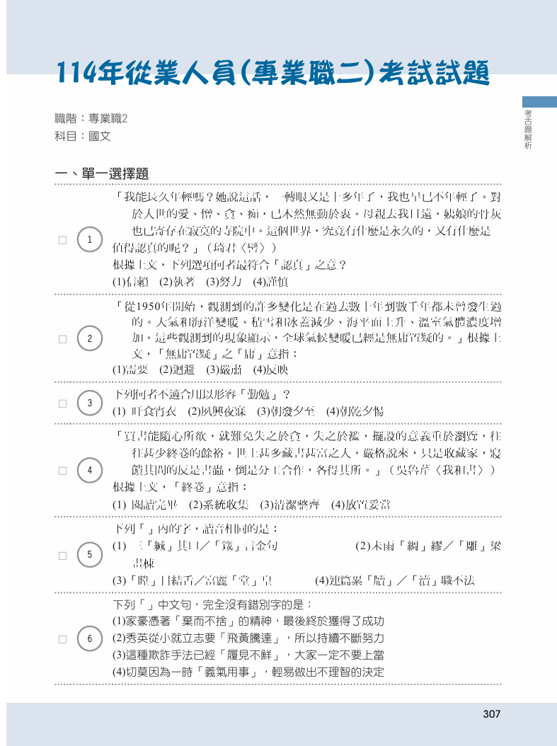 國文領域浩瀚無涯,如基礎字音、字形、字義,如成語,如修辭,如國學及文學常識,或如應用文等,皆含括於國文領域中,使得考生不論在準備或應考時,常不知如何舉措。其實,由命題分析中可以看出,準備國文並非茫然無頭緒,而是有軌跡可循的。