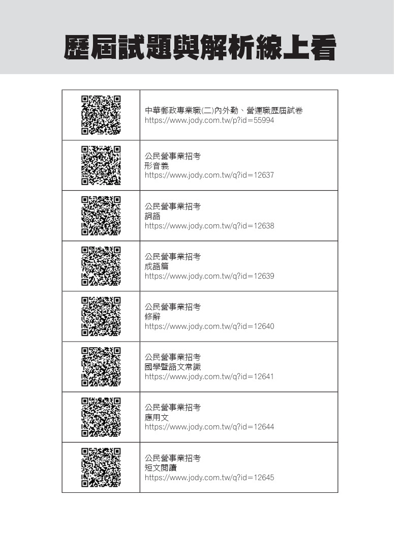快前往www.jody.com.tw,開通帳號並輸入書上的「書籍題庫啟用碼」,即可無限題數,盡情演練本科試題。