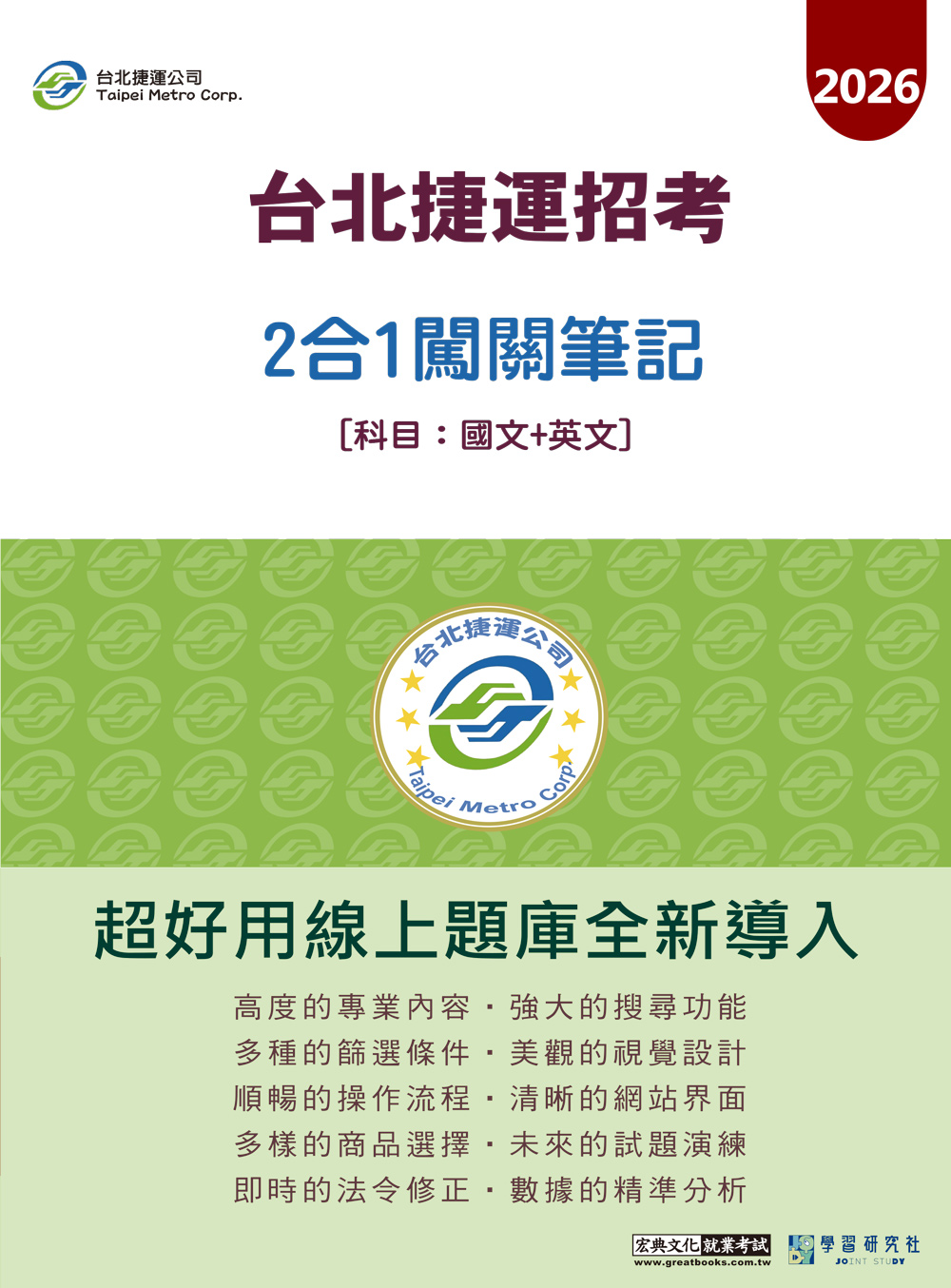 專為「台北捷運招考」設計的極速成筆記,科目有:國文、英文。各科並提供線上題庫,只要開通帳號,並輸入書上的「書籍題庫啟用碼」,即可無限題數,盡情演練捷運招考最新試題。