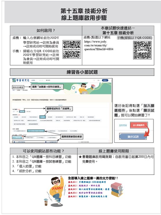 另本版對讀者最大的福音,當屬出版社終於將「線上題庫」功能建置完成。筆者有幸受邀親自試用後發現功能極其強大!! 與過去使用紙本相比,不但可以寫到更多的題目、且每一題都有詳盡的解析,還能記錄答錯的題目或收藏最愛。更厲害的是,出版社進一步將「數據分析」、「資料庫篩選」功能導入,不僅將數量龐大的題庫按落點分章節,還可以從試題屬性或關鍵字下手,透過不同面向找出軟肋來重點加強。對於喜歡透過寫考題準備考試的考生而言,無疑是最佳輔助工具,在此也向本書讀者們大力推薦!!