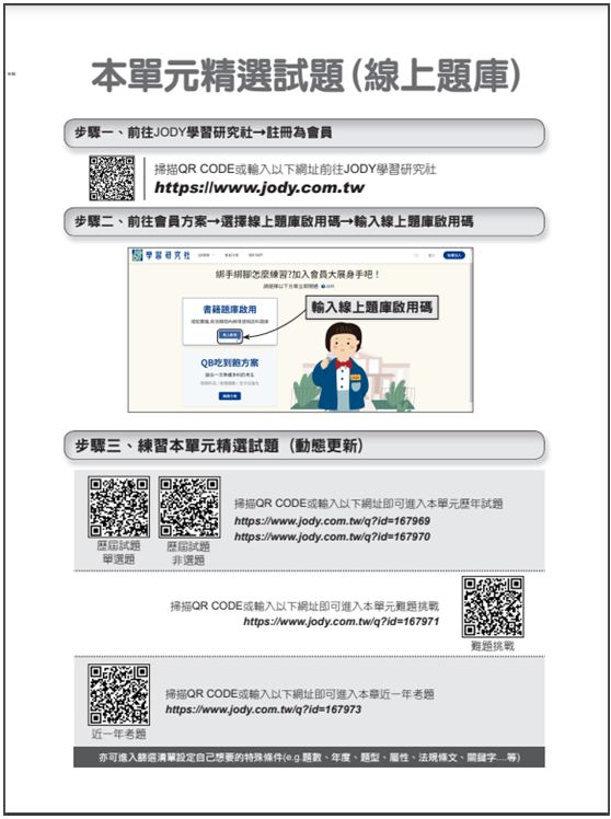 快前往www.jody.com.tw,開通帳號並輸入書上的「書籍題庫啟用碼」,即可無限題數,盡情演練本科試題。